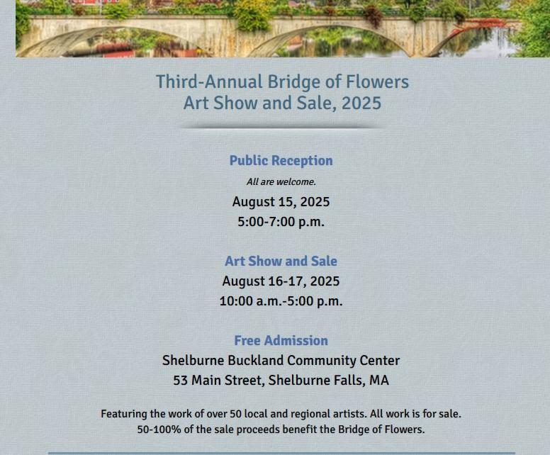 Sunday, August 17, 2025, 10:00 am until 5:00 pm Shelburne Buckland Community Center, 53 Main St., Shelburne Falls MA 01370