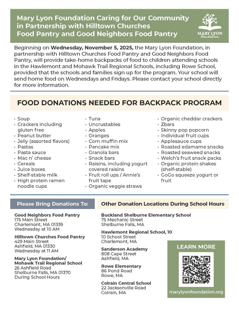 Beginning Wednesday Nov.5th The Mary Lyon Foundation, in partnership with Hilltown Churches Food Pantry and Good Neighbors Food Pantry, will provide take home backpacks of food to children attending schools in the Hawlemont and Mohawk Trail Regional Schools, including Rowe School, provided that the schools and families sign up for the program. Your school will send home food on Wednesday and Fridays. Please contact your school directly for more info.