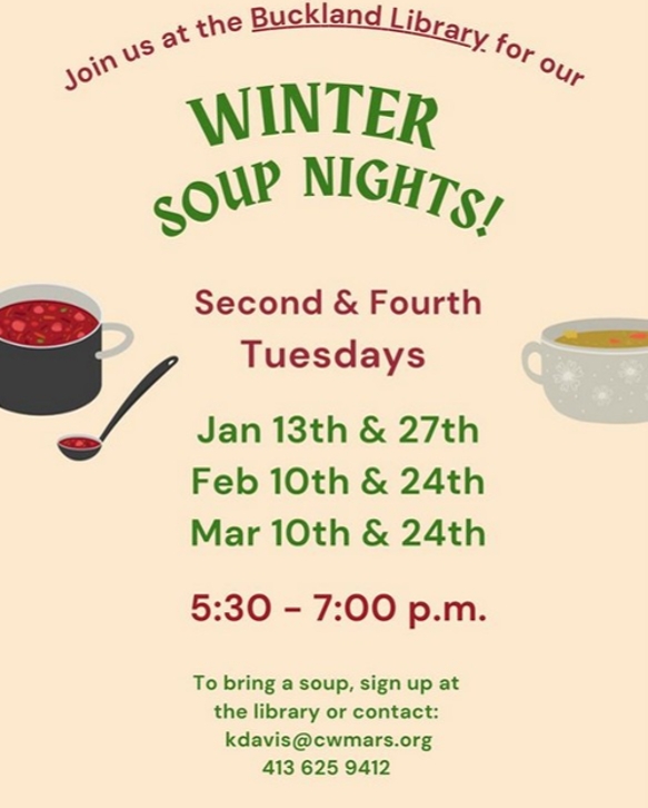 To bring a soup, sign up at the library or contact kdavis@cwmars.org 413.625.9412